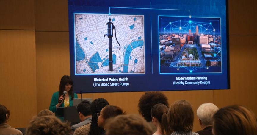Leah Casanave presenting her data with certain portions of the city that is historically involved in health