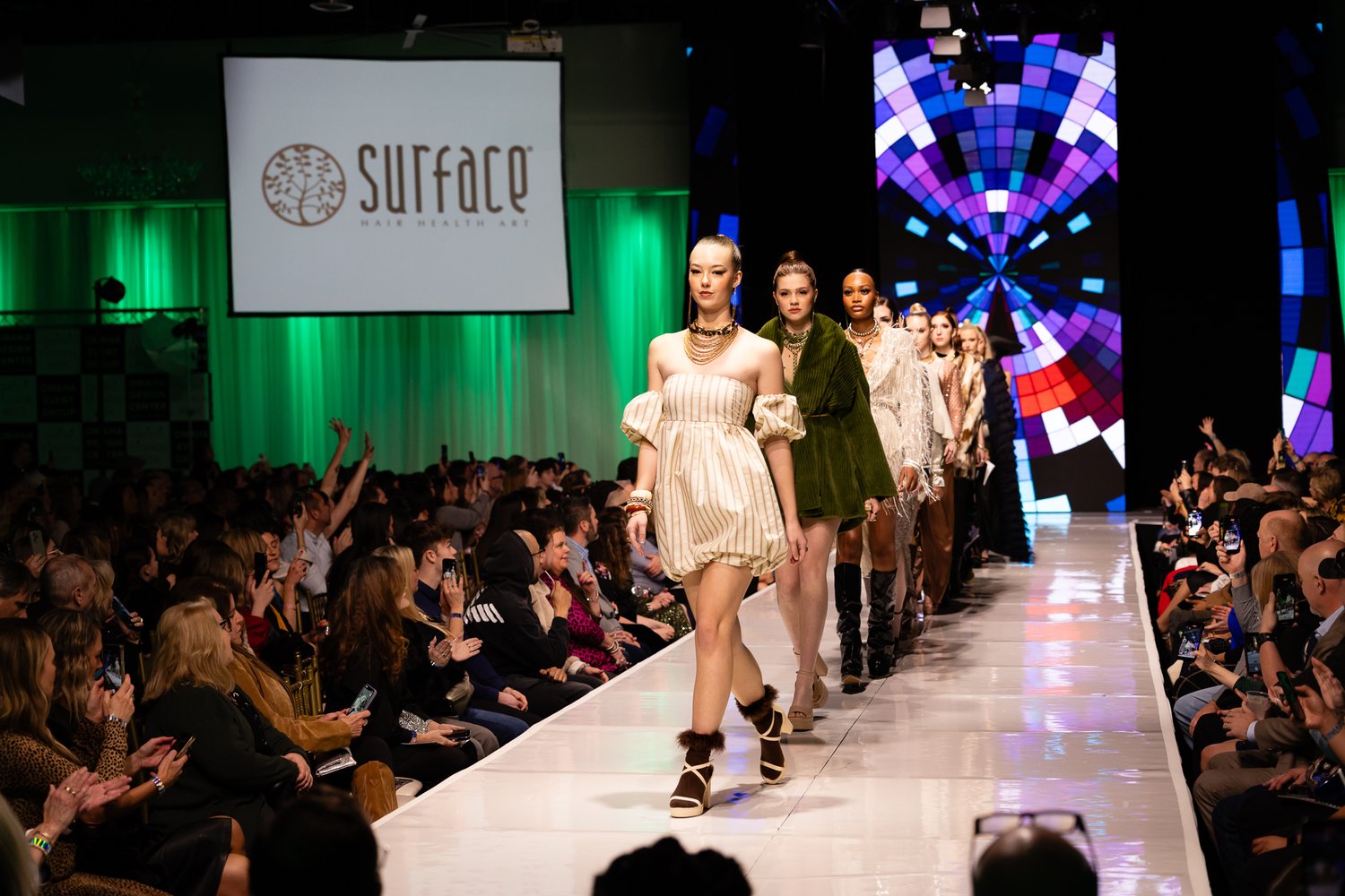 Our emcee, Maria Corpuz, hosted our show with confidence and charisma. She was styled by the incredibly talented, Sydney Moore, with her sustainably sourced secondhand and vintage finds. Our backstage Beauty Alliance run by SOHO Hair Academy, using Surface hair care products are absolutely killing the hair and makeup game!