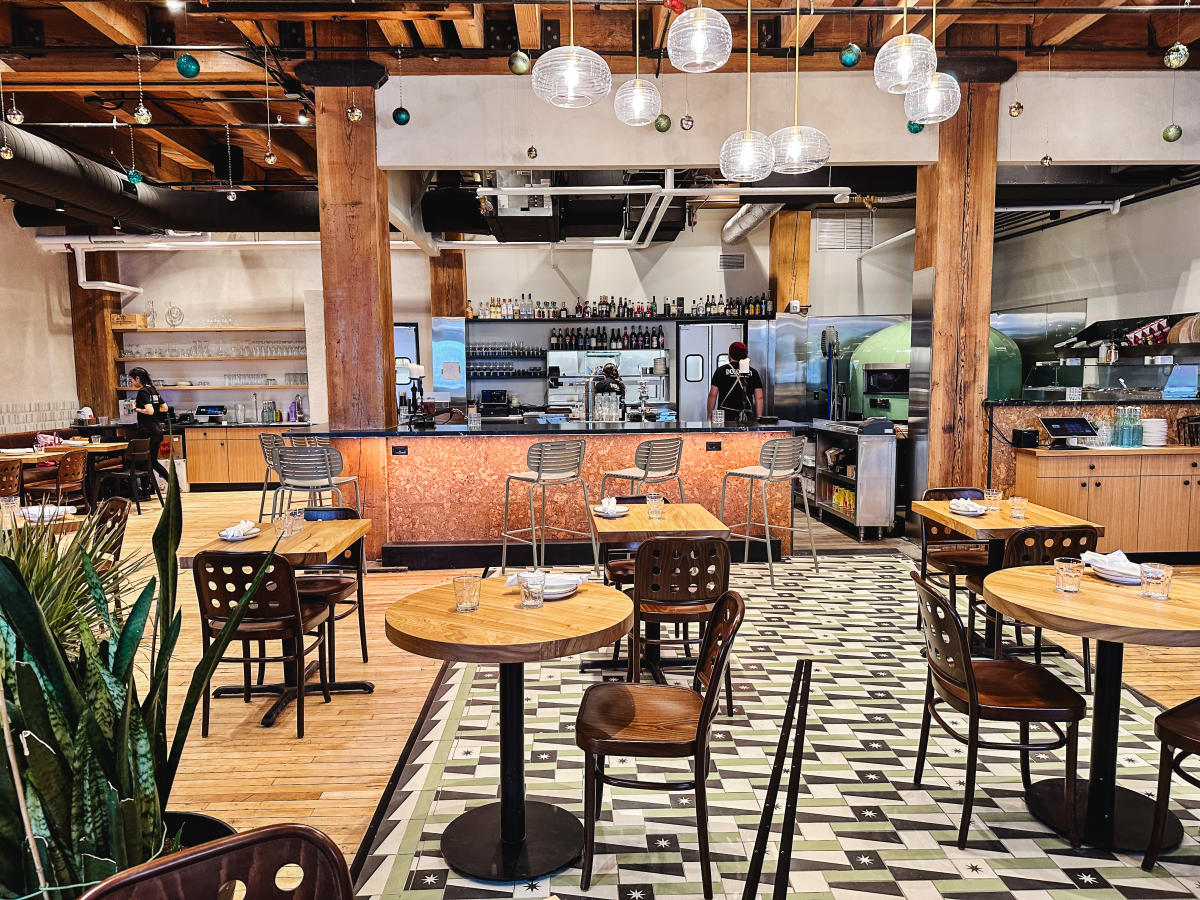 Our oven is imported from Verona, Italy. It’s wood-and-gas-fired, pistachio green and a total workhorse. We designed the space so guests can watch their pizzas being made, sip wine, enjoy antipasti, dessert — the full European pizzeria experience.